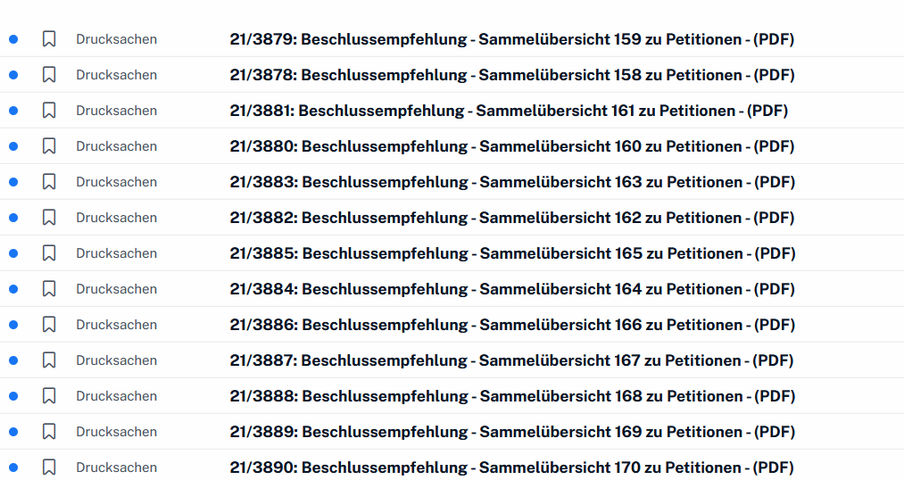 Der Petitionsausschuss des Deutschen Bundestags hat letzte Woche mal wieder seine Sammelübersichten an das Plenum überstellt. Das sieht in meinem Feedreader dann üblicherweise so aus: